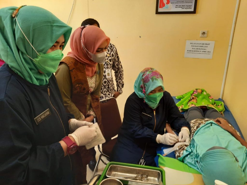 Ketua TIM Penggerak PKK Kudus Mawar Hartopo bersama IBI melihat bhakti sosial pelayanan KB di Puskesmas Ngembalrejo, rabu (21/4/2021)