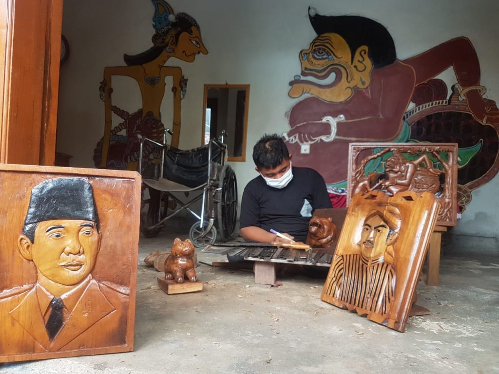 Kudus, berdikarinews.id – Pemuda penyandang disabilitas, Sulikin warga Desa Kutuk, Kecamatan Undaan memanfaatkan limbah kayu mebel untuk menghasilkan karya. Bahkan kerajinannya bernilai jual tinggi, dia membuat patung dan ukiran wajah dari kayu limbah itu.