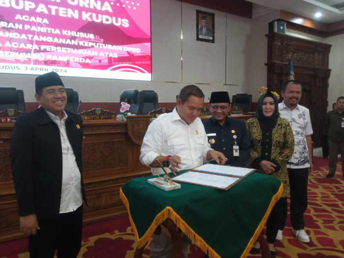 BERDIKARINEWS.ID – Dewan Perwakilan Rakyat Daerah (DPRD) Kabupaten Kudus sahkan 10 Rancangan Peraturan Daerah (Ranperda) setelah rampung dibahas dan mendapat fasilitasi Pemprov Jateng. Penetapan 10 Ranperda digelar di ruang Rapat Paripurna DPRD Kudus, Rabu (3/4/2024).