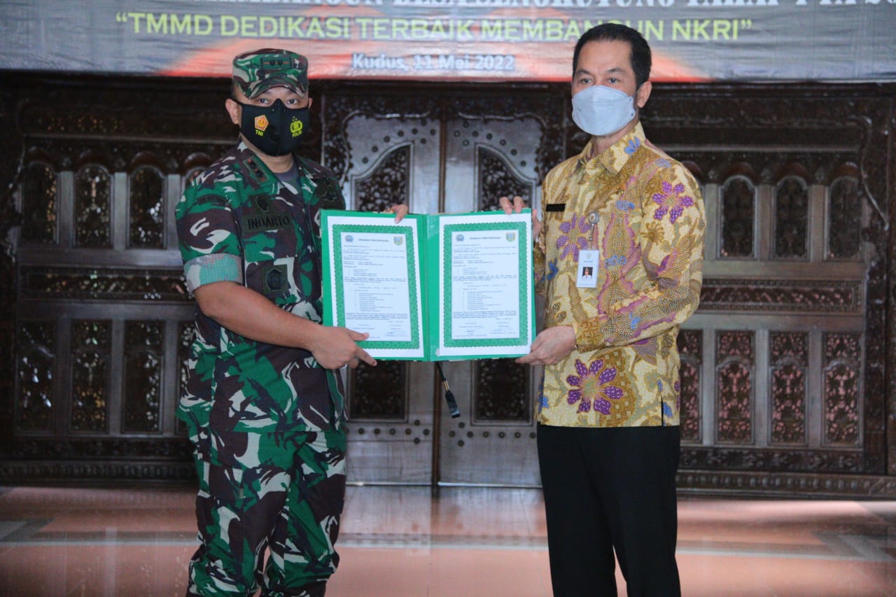 Kudus, berdikarinews.id – Bupati Kudus Hartopo menyerahkan pengerjaan program TNI Manunggal Membangun Desa (TMMD) Sengkuyung tahap I tahun anggaran 2022 pada Komandan Kodim 0722/Kudus Letkol Kav. Indarto di Pendapa, Rabu (11/5/2022). Disaksikan perwakilan Forkopimda Kudus, Sekda Kudus, Asisten Pemkesra, Kepala Dinas PMD, Camat Undaan, serta Kades Wates